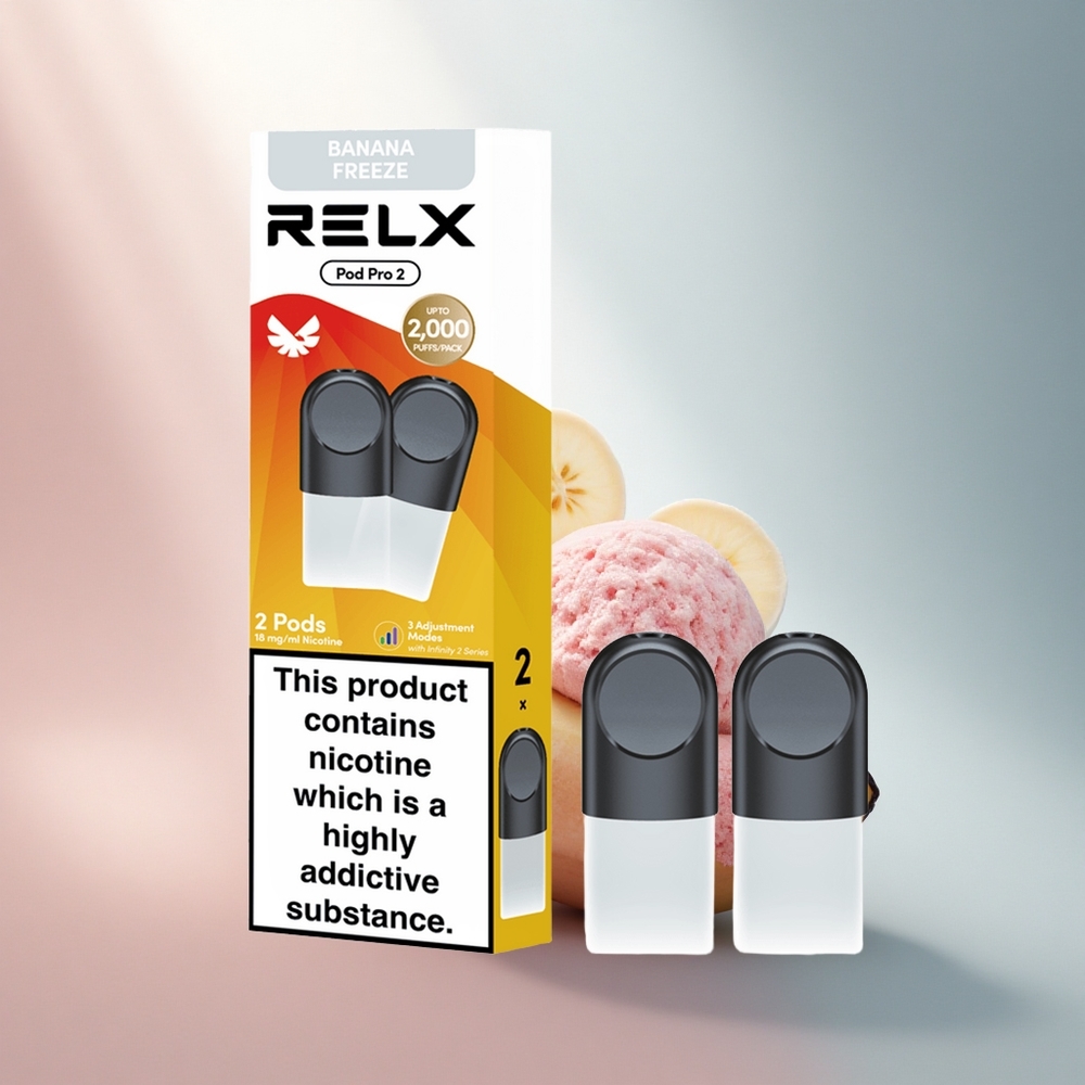 Relx Pod Pro 2 Vape Device Glacé Banane Dessert 18mg/ml – 1.9ml / 2 ou 3 pods – 3 Modes: Éco (5.5W), Doux (6.5W), Boost (8W)